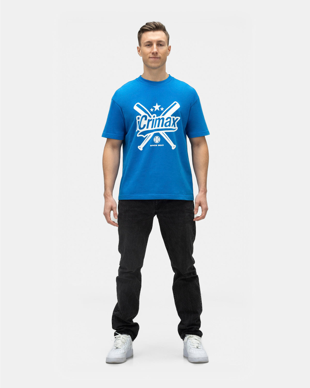 Das T-Shirt in Blau kommt im cleanen Streetwear-Look und trägt den markanten iCrimax-Baseball-Print auf der Front. Der hochwertige Logoprint sorgt für sofortigen Wiedererkennungswert – ganz nach dem Motto: cool bleiben, aber auffallen!